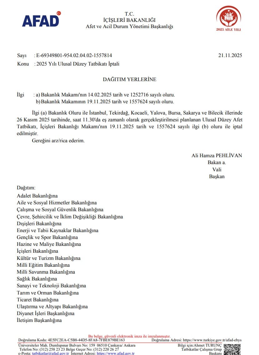İçişleri Bakanlığı’na bağlı Afet ve Acil Durum Yönetimi Başkanlığı (AFAD), 14 Şubat 2025’te yaptığı duyuru ile 26 Kasım’da Marmara Bölgesi genelinde ‘Ulusal Afet Tatbikatı‘ başlığıyla geniş kapsamlı bir deprem tatbikatı yapılacağını duyurmuştu.