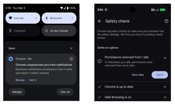 Bu özellikle beraber rahatsız edici site bildirimleri sona erecek. Tarayıcı, bildirimlerin iptal edildiğine dair bir uyarı gönderecek. Bir sitenin izinleri iptal edildiğinde, kullanıcı bu izinleri Güvenlik Kontrolü üzerinden veya doğrudan ilgili siteye giderek yeniden etkinleştirebilecek. İstenildiği takdirde, bu otomatik bildirim kapatma özelliği devre dışı bırakılabilecek.