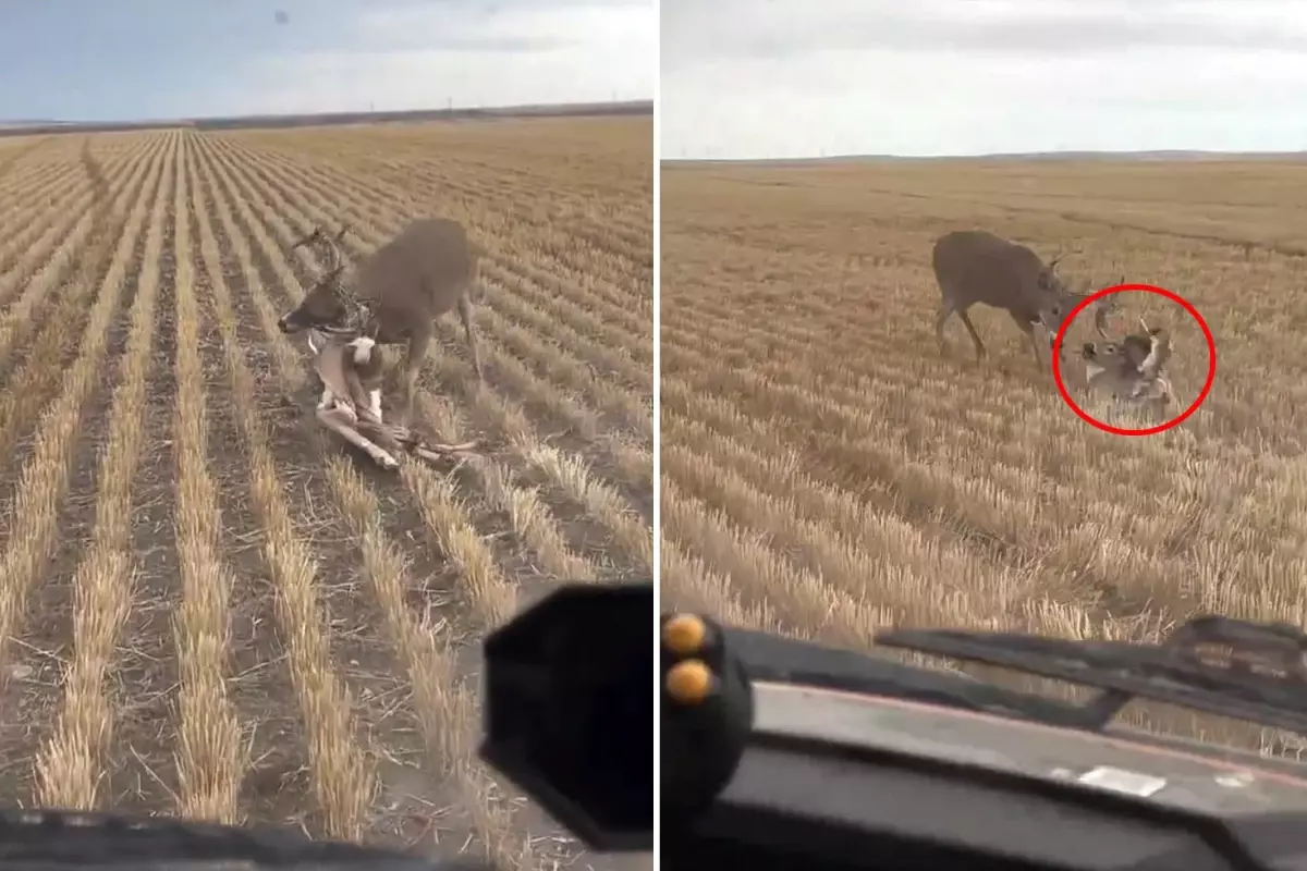 Tarlalarını kontrol etmek için aracıyla bozkıra çıkan bir vatandaş, karşılaştığı manzara karşısında şaşkına döndü. Cep telefonu kamerasına yansıyan görüntülerde, bir geyiğin boynuzlarına takılan ölü bir geyiğin cansız bedeninden kurtulmaya çalıştığı anlar yer alıyor.