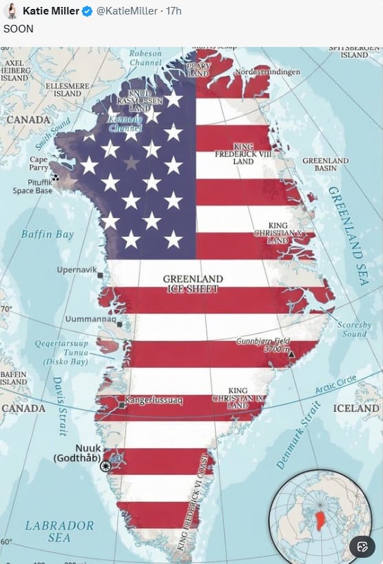 Eski Amerika Birleşik Devletleri Başkanlık İstihbarat Danışma Kurulu Üyesi Katie Miller da sosyal medya hesabından “Grönland’ı işgal etme zamanı geldi” şeklinde bir görsel paylaşmıştı.