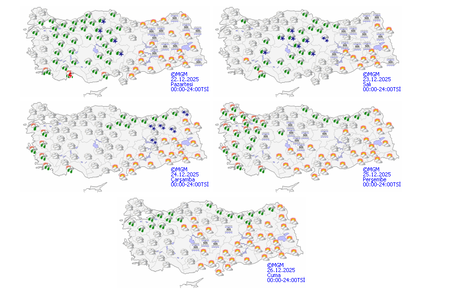 Meteoroloji, 22 Aralık hava durumu raporunu yayımladı. Rapora göre; İstanbul, Kırklareli, Afyonkarahisar, Denizli, İzmir, Muğla, Antalya, Isparta, Konya, Düzce, Sinop, Zonguldak ve Amasya’da sağanak, Kütahya, Ankara, Eskişehir, Kayseri ve Bolu’da karla karışık yağmur ve kar yağışı bekleniyor. Hava sıcaklıklarının yurt genelinde mevsim normalleri civarında seyredeceği tahmin ediliyor.